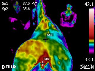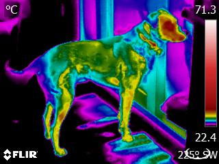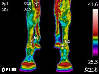 Infrared thermography provides a detailed image of localised temperatures on the body surface of an animal. The temperature of bilateral symmetrical body parts can then be compared with each other for areas of increased or reduced temperature. At the same time the local temperatures can be compared to a normal ideal temperature pattern for a particular area. Many factors influence the local skin surface temperature. These will have to be accounted or controlled for before a useful conclusion can be drawn*.